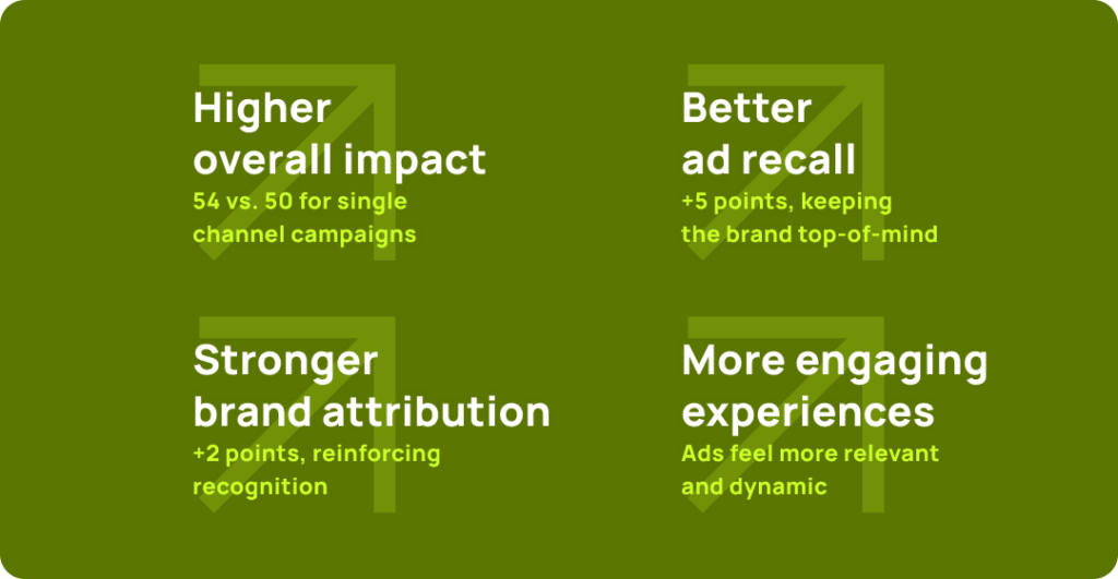 Plutôt que de s’appuyer sur un seul point de contact pour faire passer un message, les marques qui diffusent leurs campagnes sur plusieurs canaux — CTV, vidéo en ligne, display, réseaux sociaux — maximisent leur visibilité, améliorent la reconnaissance de marque et stimulent l’engagement.