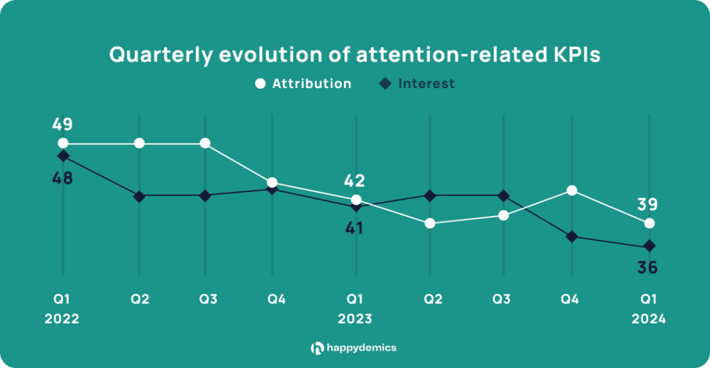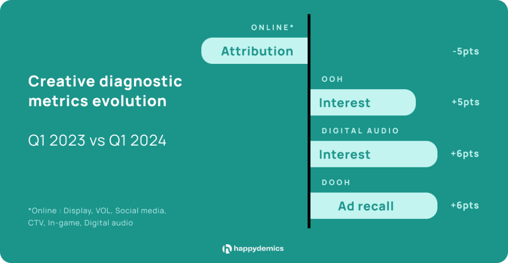 Most media are experiencing a decline in creative diagnostic KPIs, which assess the inherent qualities of an ad creative (interest, clarity, attribution, enjoyment). This decline is particularly noticeable online (Display, VOL, social media, CTV, In-game advertising, digital audio), where attribution is down 5 points from Q1 2023.