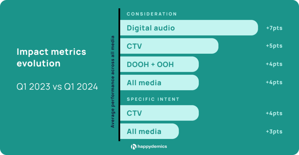 DOOH, OOH, and digital audio are particularly effective in increasing brand consideration, as is CTV, which also promotes concrete and immediate actions. It stands to reason that DOOH, OOH, and digital audio will perform better due to their ability to capture attention in a saturated environment. VOL and CTV benefit from the strength of the video format, both entertaining and high quality, to convey the right messages and maximise the influence of advertising recall on impact indicators.