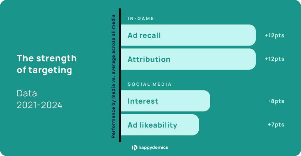 Compared to the average of all media from 2021 to 2024, the in-game format stands out significantly with +12 points in ad recall, proving that this format is a highly effective showcase for brand promotion. Social media also performs much better than the average of other media, both in terms of message quality and relevance.
