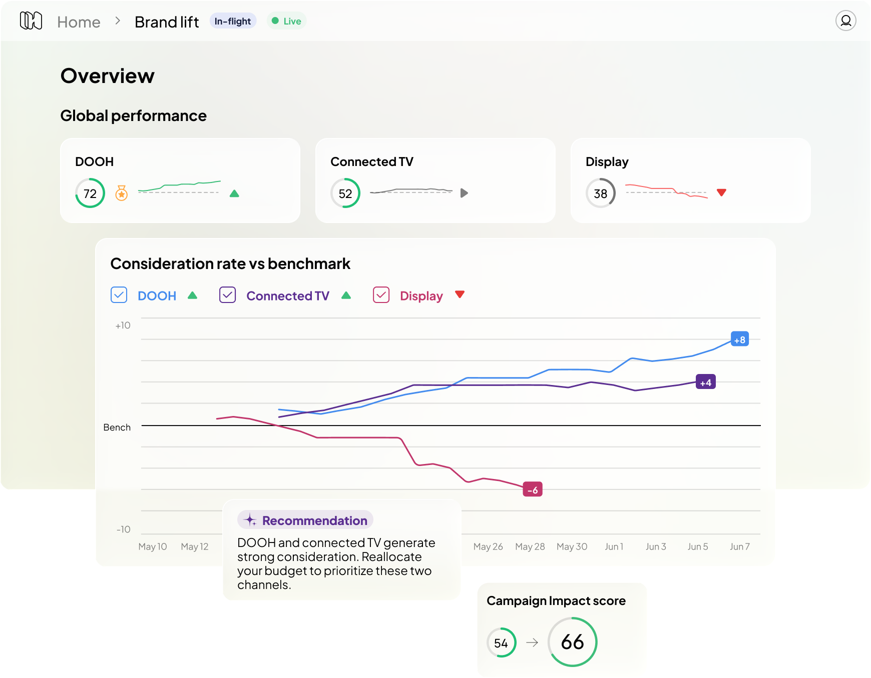 Your campaign is live. Your budget is moving. In-flight delivers Brand lift metrics in real time. So every decision is yours to make, not to regret. From the very first impression, you optimize what actually pays.